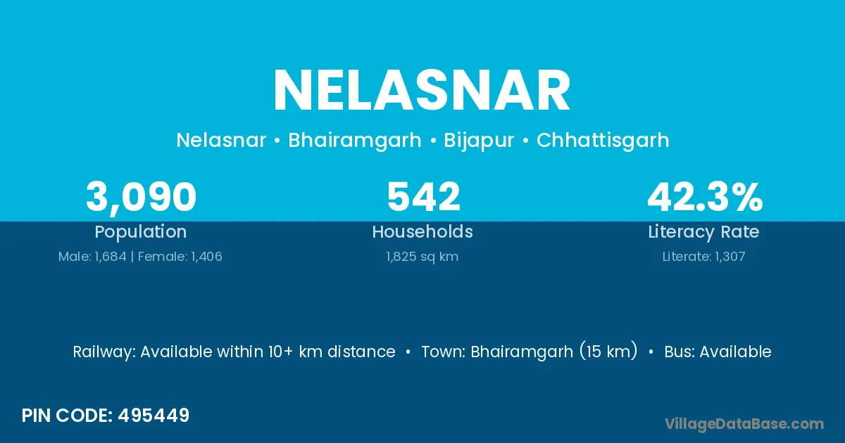 Bhairamgarh (15 km) is the nearest town to Nelasnar village for major economic activities and is located approximately 15 km away.