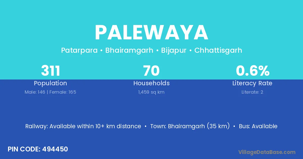 Bhairamgarh (35 km) is the nearest town to Palewaya village for major economic activities and is located approximately 35 km away.