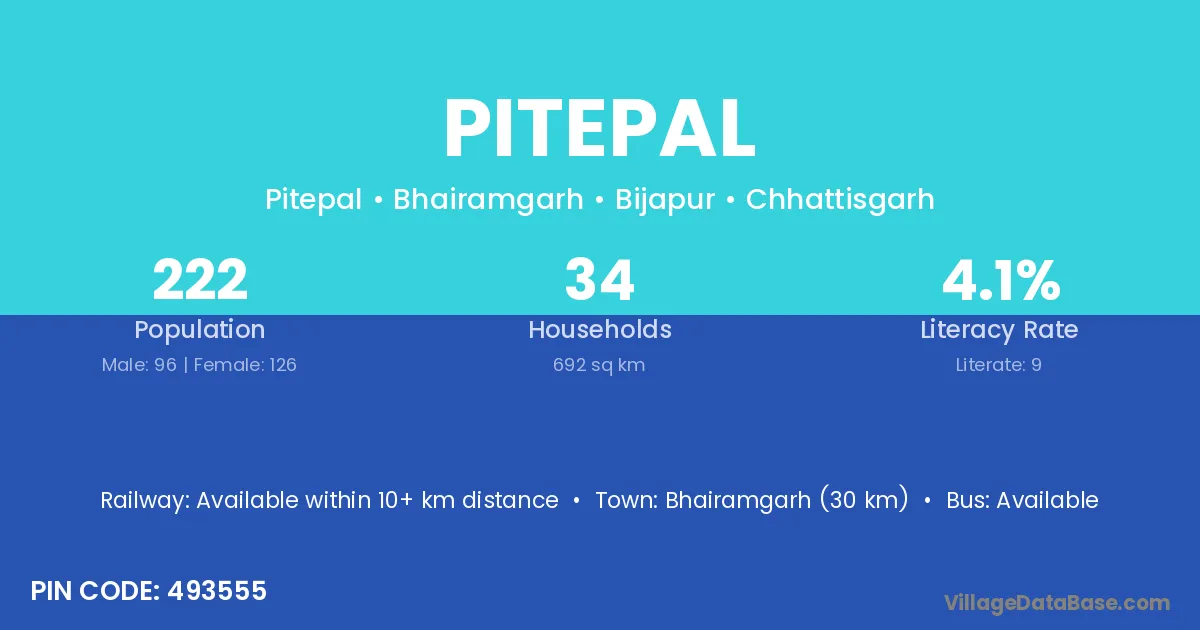 Bhairamgarh (30 km) is the nearest town to Pitepal village for major economic activities and is located approximately 30 km away.