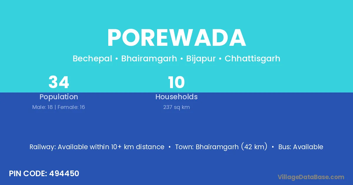 Bhairamgarh (42 km) is the nearest town to Porewada village for major economic activities and is located approximately 42 km away.