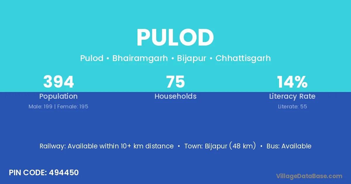Bijapur (48 km) is the nearest town to Pulod village for major economic activities and is located approximately 48 km away.