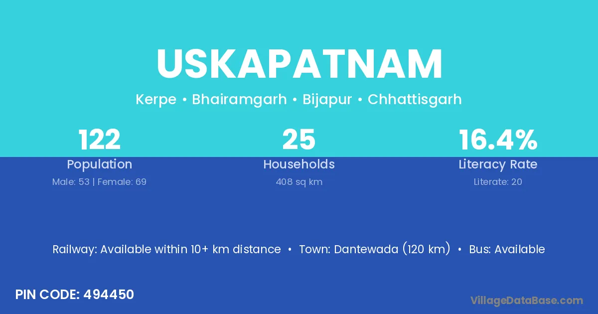 Dantewada (120 km) is the nearest town to Uskapatnam village for major economic activities and is located approximately 120 km away.