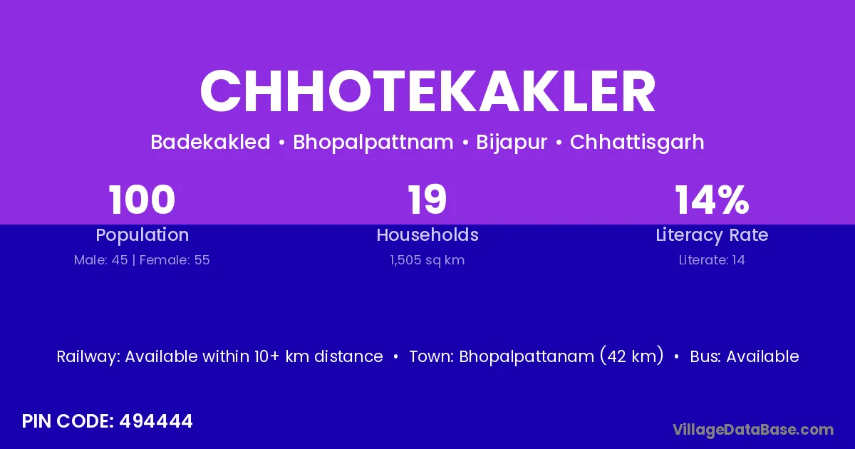 Bhopalpattanam (42 km) is the nearest town to Chhotekakler village for major economic activities and is located approximately 42 km away.