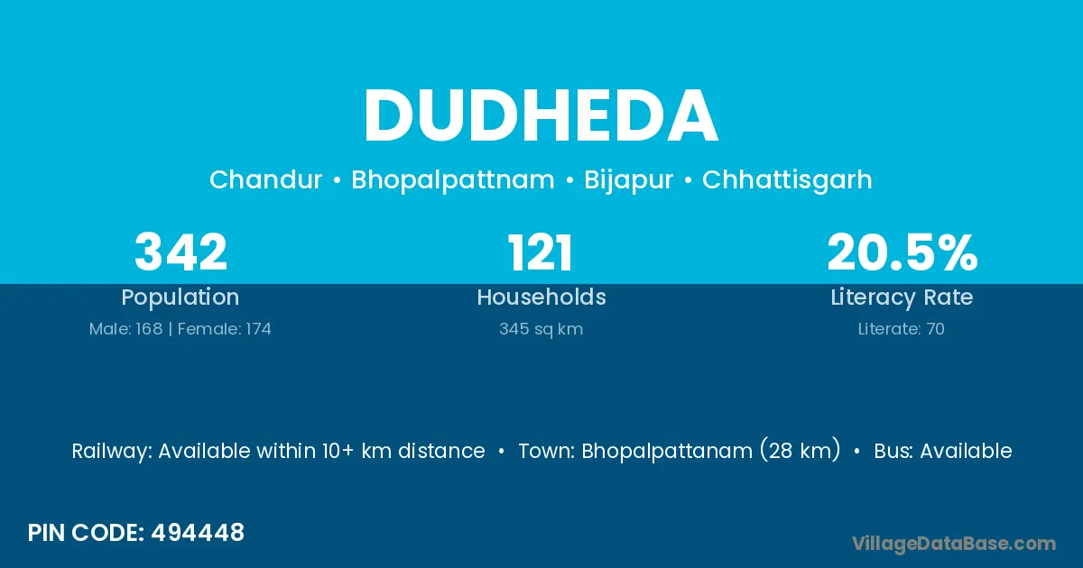 Bhopalpattanam (28 km) is the nearest town to Dudheda village for major economic activities and is located approximately 28 km away.