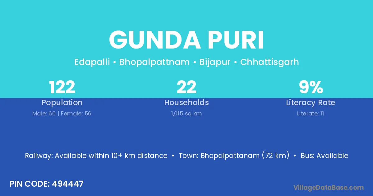 Bhopalpattanam (72 km) is the nearest town to Gunda Puri village for major economic activities and is located approximately 72 km away.