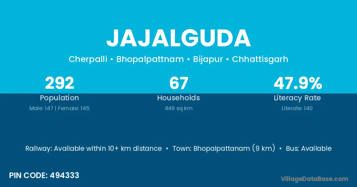 Bhopalpattanam (9 km) is the nearest town to Jajalguda village for major economic activities and is located approximately 9 km away.