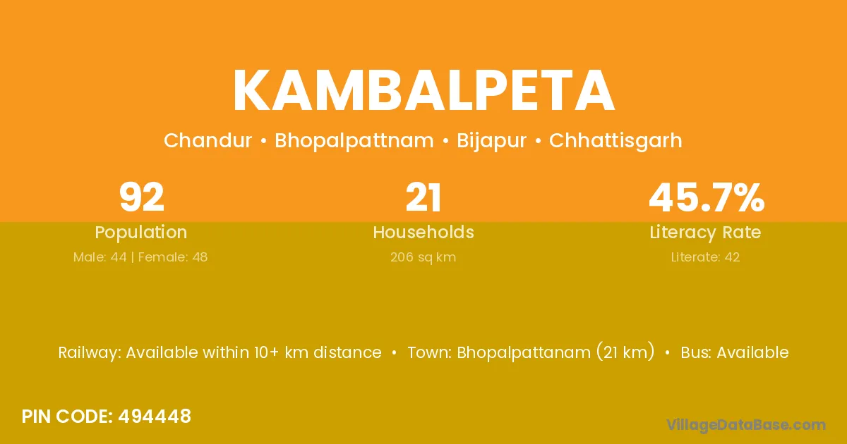 Bhopalpattanam (21 km) is the nearest town to Kambalpeta village for major economic activities and is located approximately 21 km away.