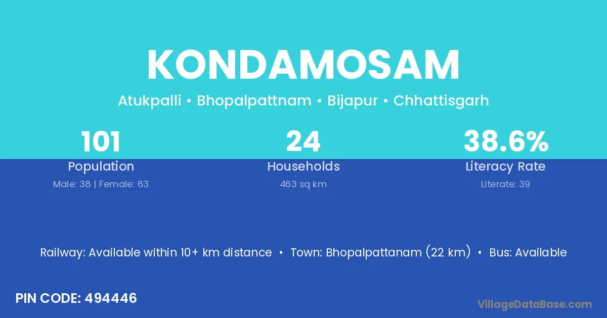 Bhopalpattanam (22 km) is the nearest town to Kondamosam village for major economic activities and is located approximately 22 km away.