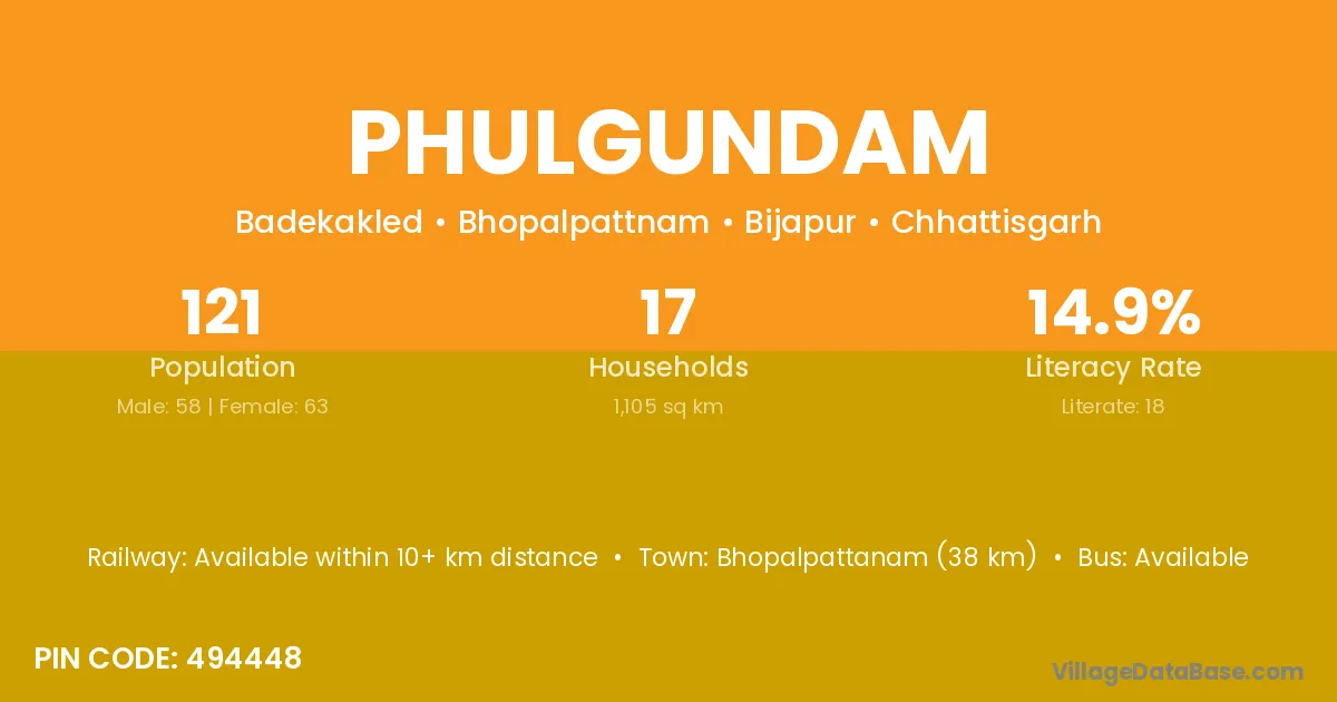 Phulgundam village has a total population of 121 people, of which 58 are males and 63 are females.