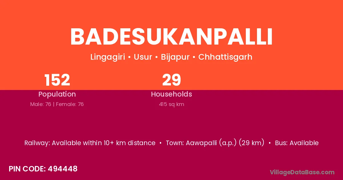 Badesukanpalli village has a total population of 152 people, of which 76 are males and 76 are females.