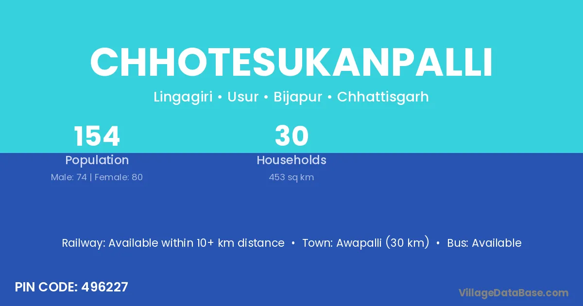Awapalli (30 km) is the nearest town to Chhotesukanpalli village for major economic activities and is located approximately 30 km away.