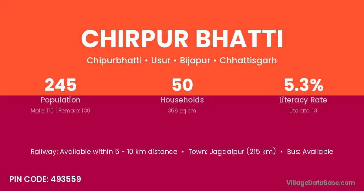 Jagdalpur (215 km) is the nearest town to Chirpur Bhatti village for major economic activities and is located approximately 215 km away.