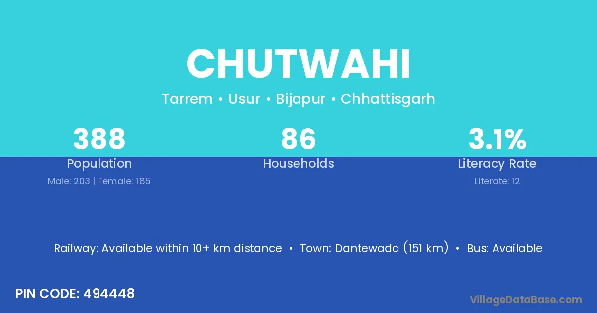 Dantewada (151 km) is the nearest town to Chutwahi village for major economic activities and is located approximately 151 km away.