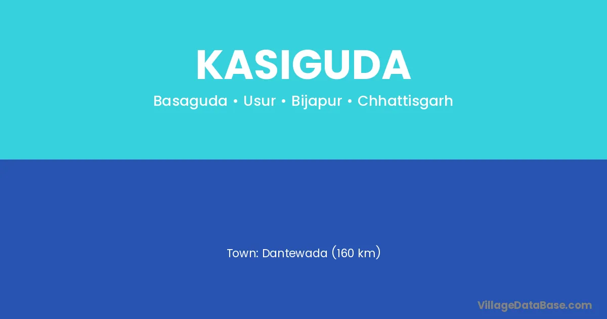 Dantewada (160 km) is the nearest town to Kasiguda village for major economic activities and is located approximately 160 km away.
