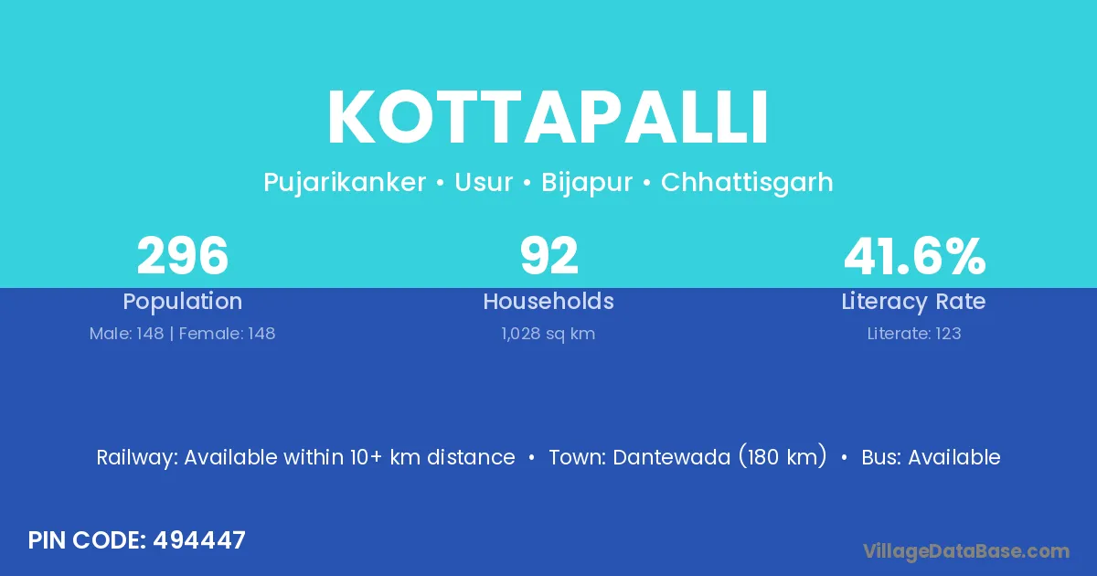 Kottapalli village has a total population of 296 people, of which 148 are males and 148 are females.