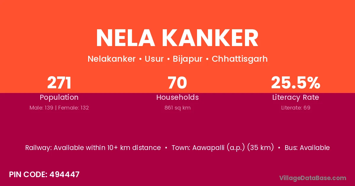 Aawapalli (a.p.) (35 km) is the nearest town to Nela Kanker village for major economic activities and is located approximately 35 km away.