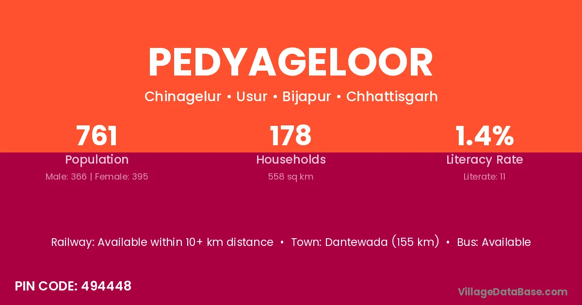 Dantewada (155 km) is the nearest town to Pedyageloor village for major economic activities and is located approximately 155 km away.