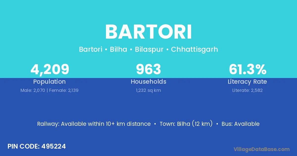 Bartori village is located in the Bilha Tehsil of the Bilaspur district in Chhattisgarh .