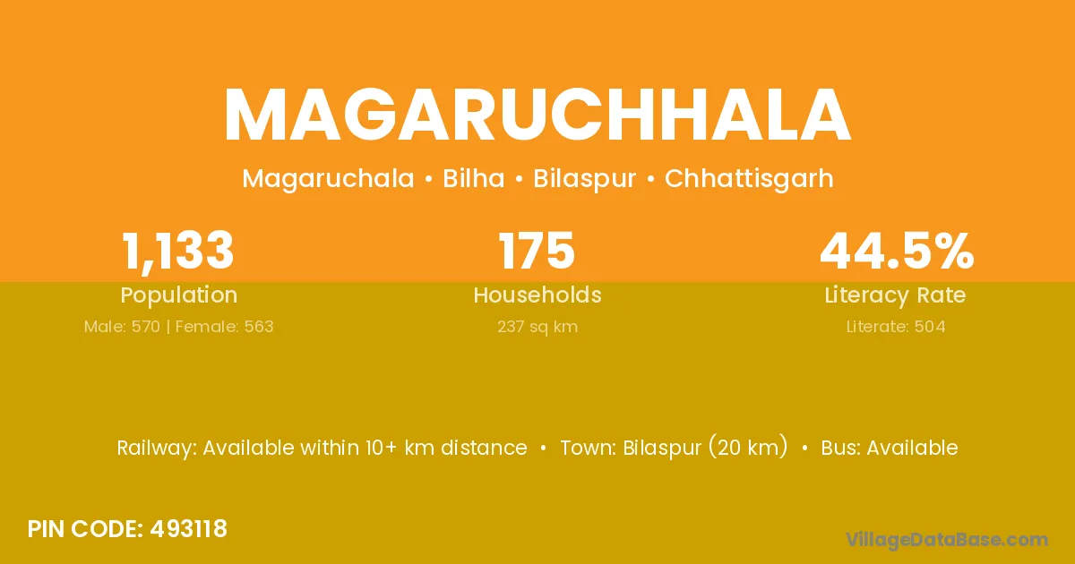 Bilaspur (20 km) is the nearest town to Magaruchhala village for major economic activities and is located approximately 20 km away.
