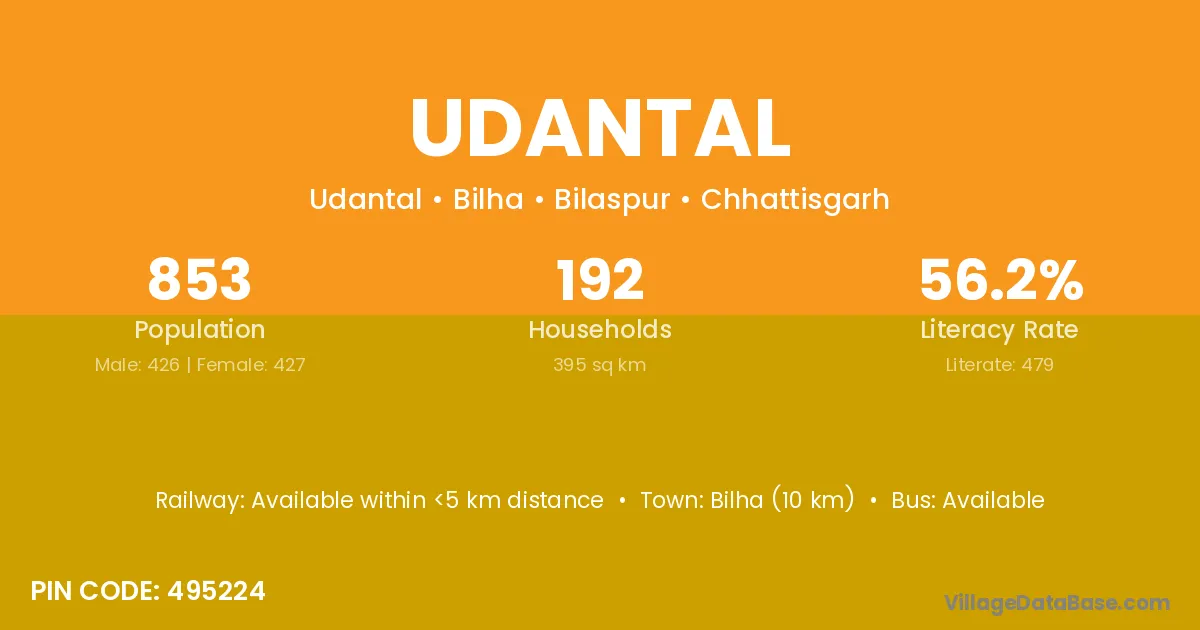 Bilha (10 km) is the nearest town to Udantal village for major economic activities and is located approximately 10 km away.