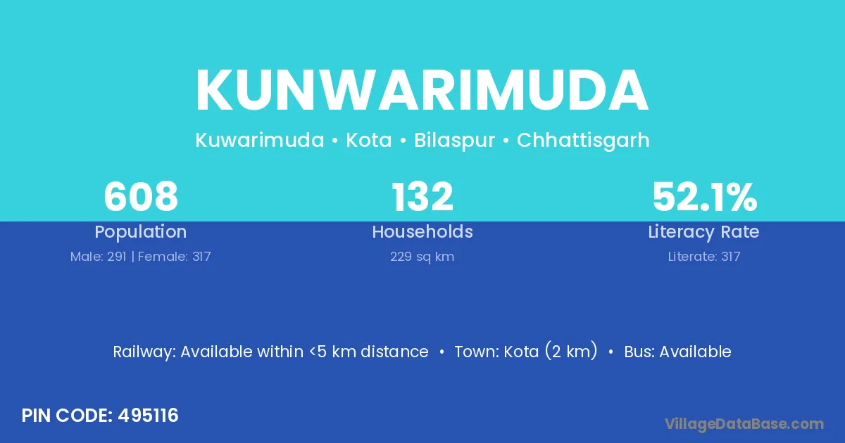 Kunwarimuda village has a total population of 608 people, of which 291 are males and 317 are females.