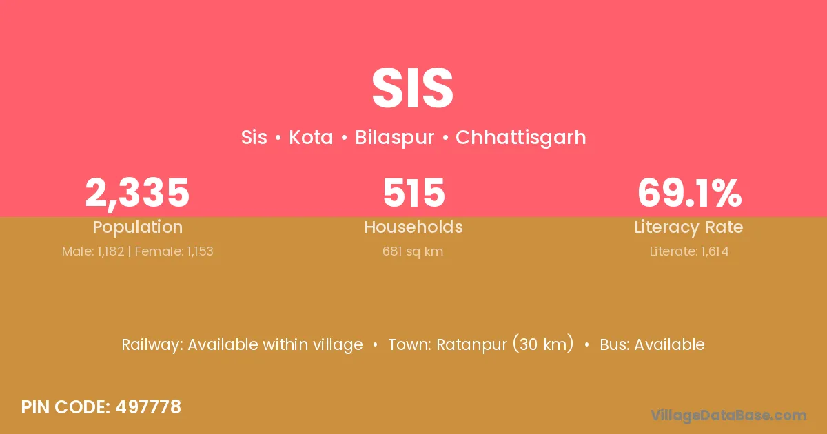 Ratanpur (30 km) is the nearest town to Sis village for major economic activities and is located approximately 30 km away.