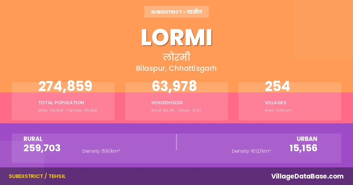 According to the 2011 census The total area of Lormi Tehsil is 1643 km², with a population of 274859 people. The population density is 167 inhabitants per square kilometre, and there are approximately 63978 houses in the sub district.