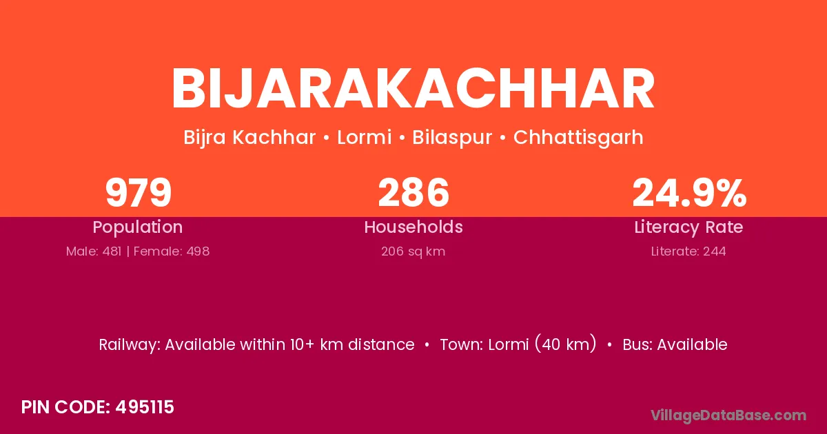Lormi (40 km) is the nearest town to Bijarakachhar village for major economic activities and is located approximately 40 km away.
