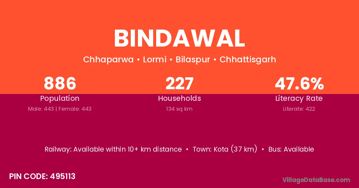 According to Census 2011 information, the village code of Bindawal village is 495113.