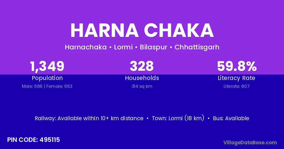 Lormi (18 km) is the nearest town to Harna Chaka village for major economic activities and is located approximately 18 km away.