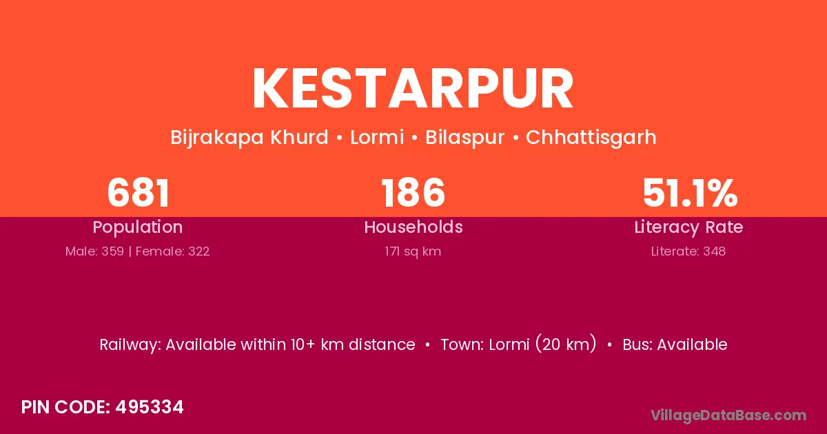 Kestarpur village has a total population of 681 people, of which 359 are males and 322 are females.