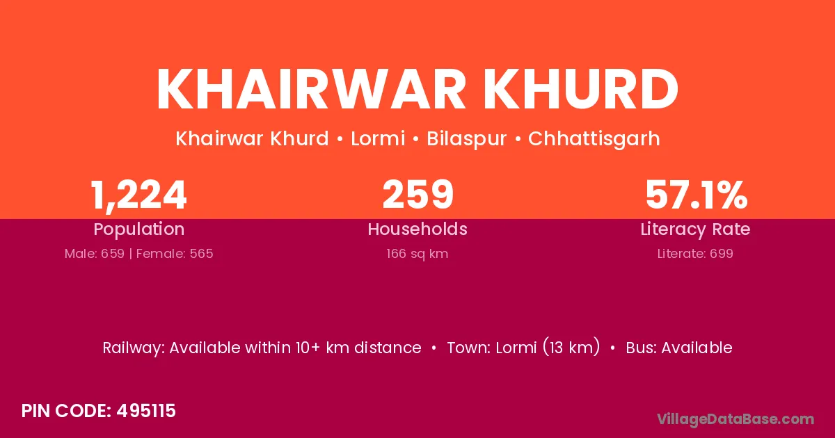 Lormi (13 km) is the nearest town to Khairwar Khurd village for major economic activities and is located approximately 13 km away.
