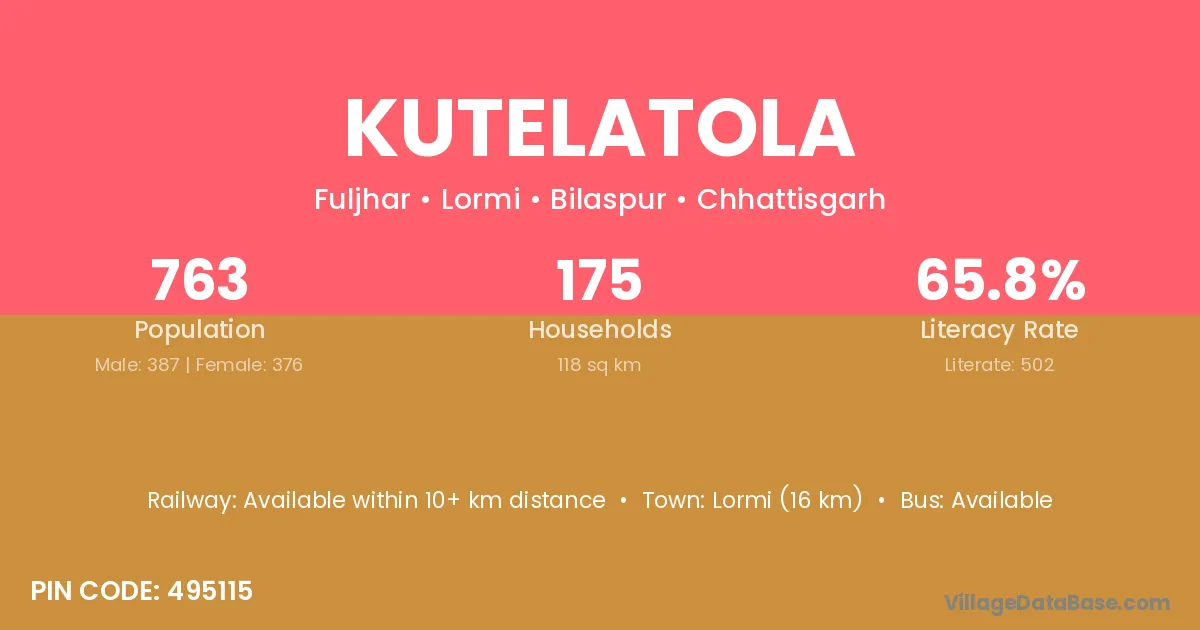 Kutelatola village has a total population of 763 people, of which 387 are males and 376 are females.