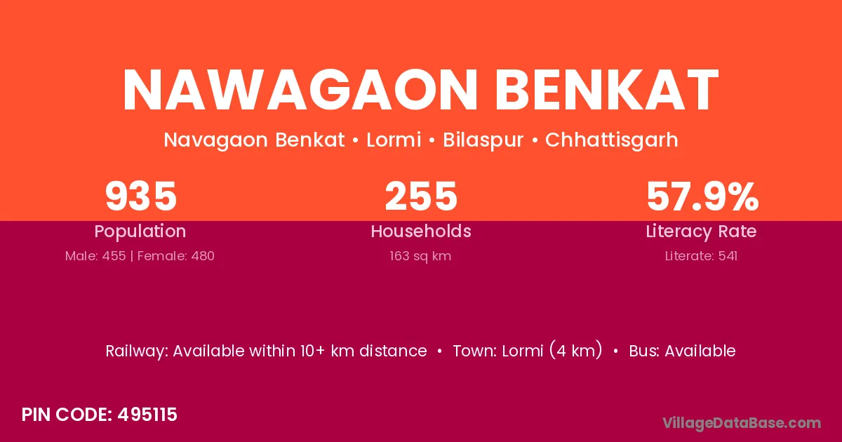 Lormi (4 km) is the nearest town to Nawagaon Benkat village for major economic activities and is located approximately 4 km away.