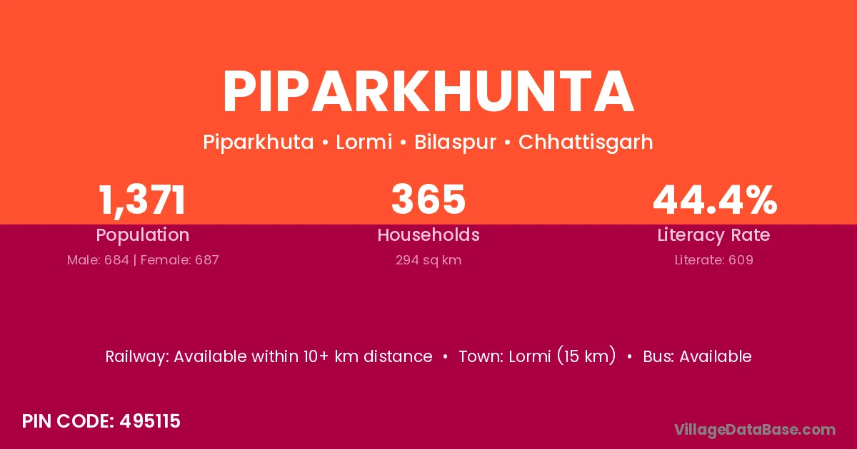 Lormi (15 km) is the nearest town to Piparkhunta village for major economic activities and is located approximately 15 km away.