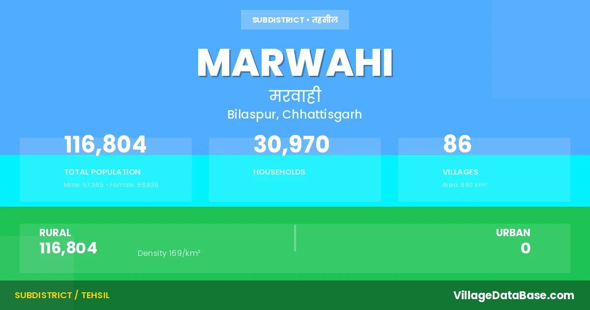 According to the 2011 census The total area of Marwahi Tehsil is 690 km², with a population of 116804 people. The population density is 169 inhabitants per square kilometre, and there are approximately 30970 houses in the sub district.