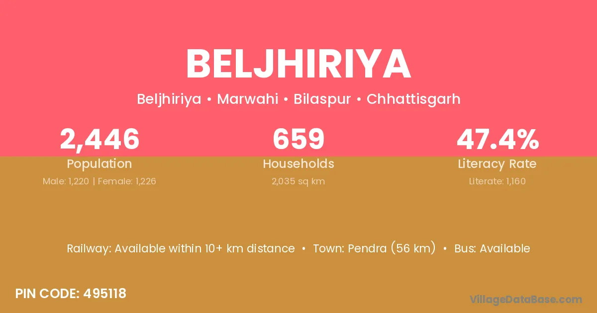 Pendra (56 km) is the nearest town to Beljhiriya village for major economic activities and is located approximately 56 km away.