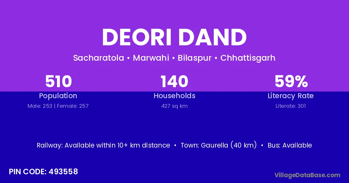 Gaurella (40 km) is the nearest town to Deori Dand village for major economic activities and is located approximately 40 km away.