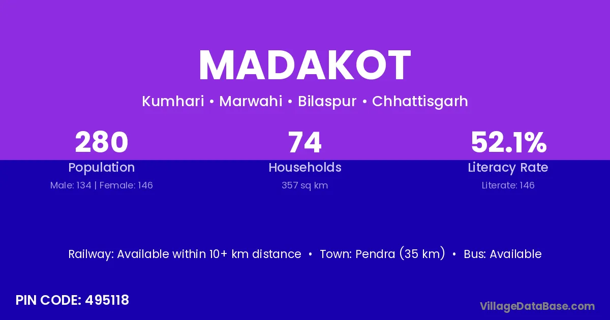 Pendra (35 km) is the nearest town to Madakot village for major economic activities and is located approximately 35 km away.