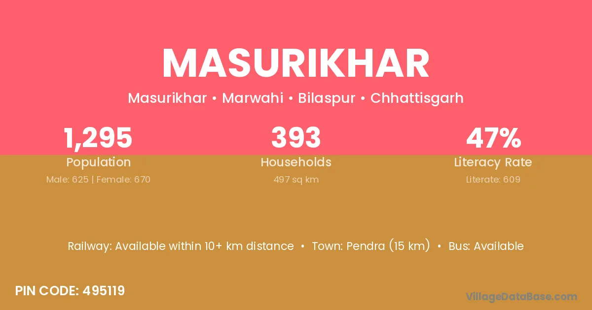 Pendra (15 km) is the nearest town to Masurikhar village for major economic activities and is located approximately 15 km away.