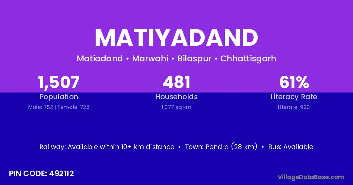 Pendra (28 km) is the nearest town to Matiyadand village for major economic activities and is located approximately 28 km away.