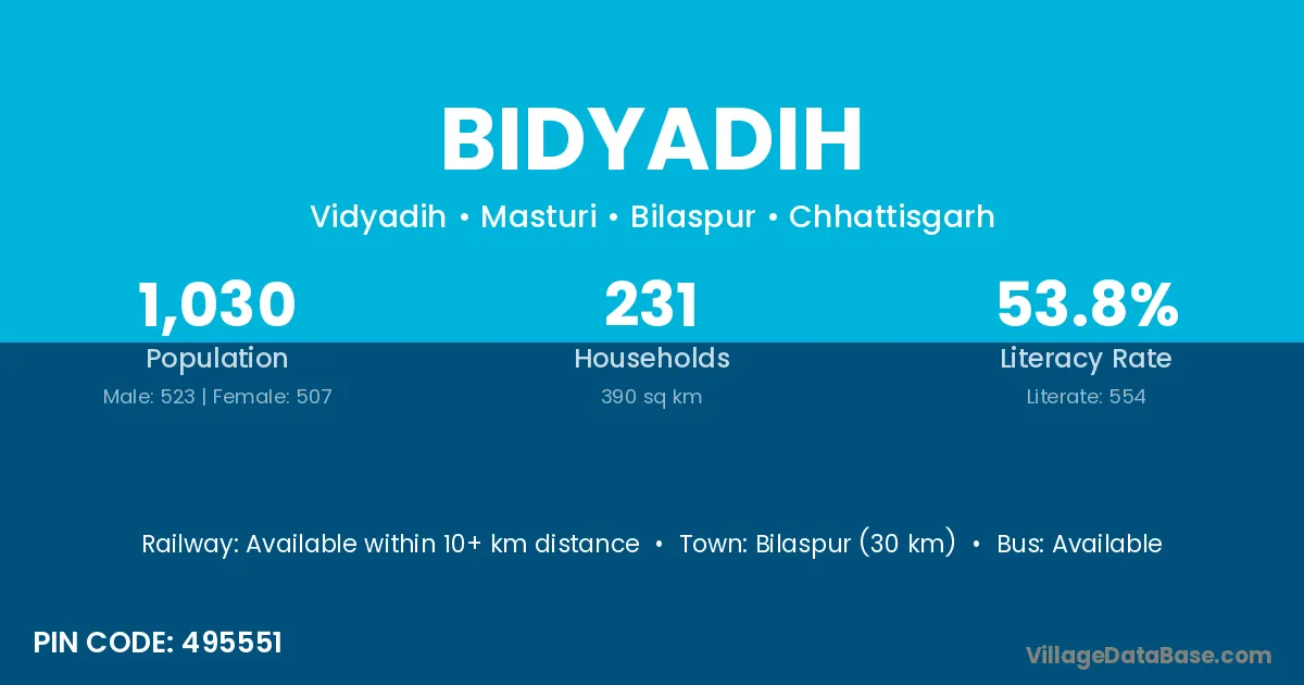 Bilaspur (30 km) is the nearest town to Bidyadih village for major economic activities and is located approximately 30 km away.