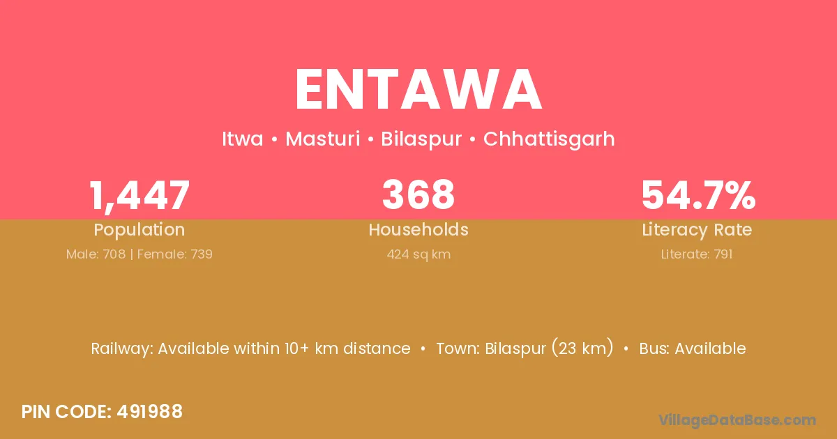 Bilaspur (23 km) is the nearest town to Entawa village for major economic activities and is located approximately 23 km away.