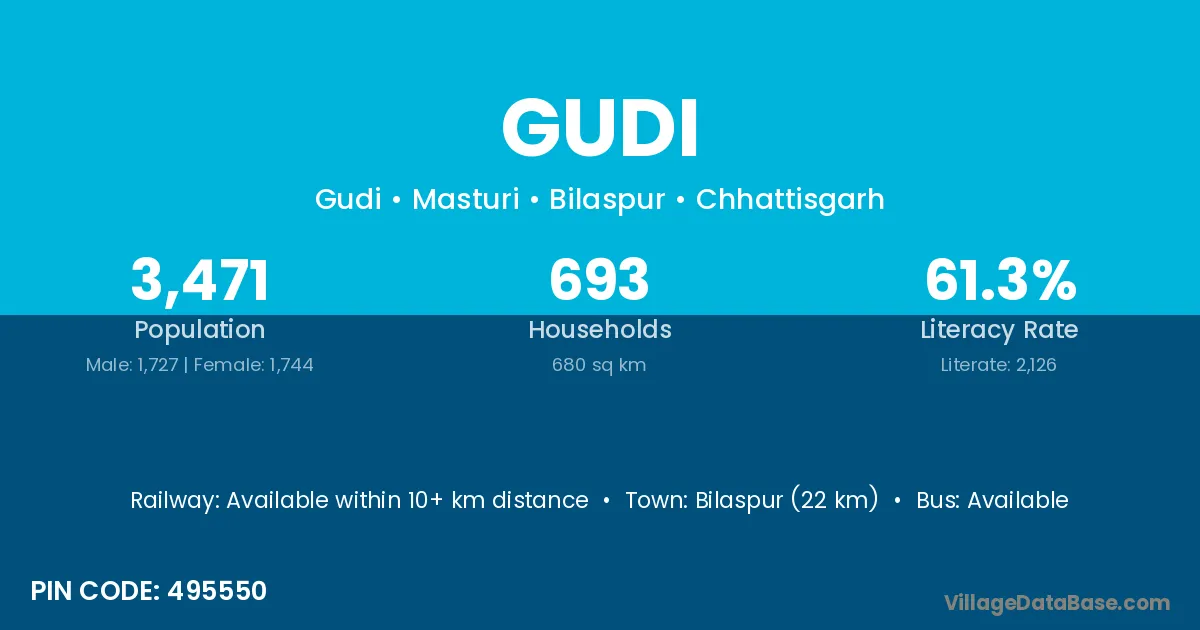Gudi village is located in the Masturi Tehsil of the Bilaspur district in Chhattisgarh .