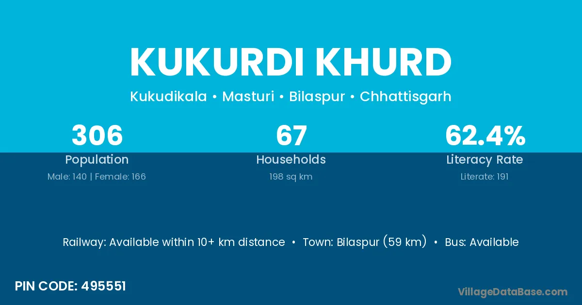 Bilaspur (59 km) is the nearest town to Kukurdi Khurd village for major economic activities and is located approximately 59 km away.