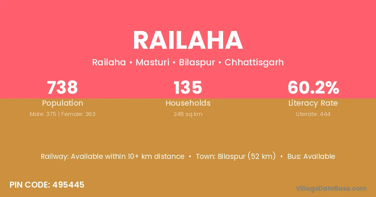 Bilaspur (52 km) is the nearest town to Railaha village for major economic activities and is located approximately 52 km away.