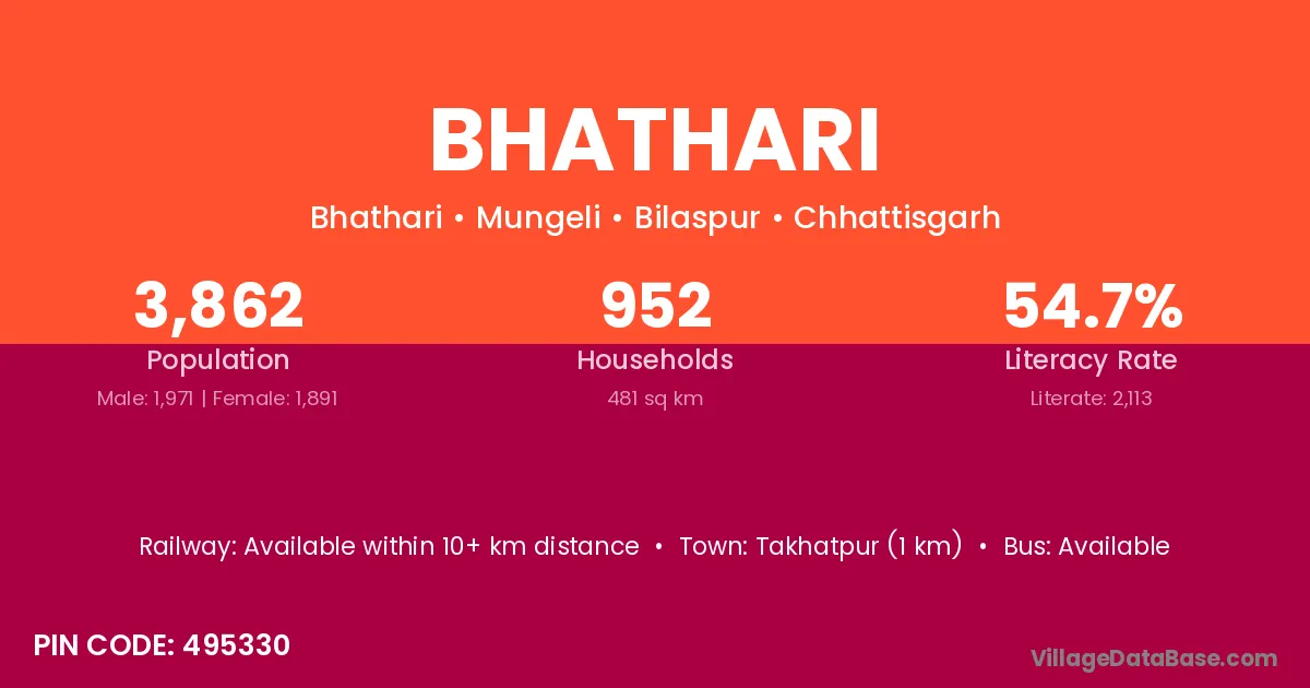 Takhatpur (1 km) is the nearest town to Bhathari village for major economic activities and is located approximately 1 km away.