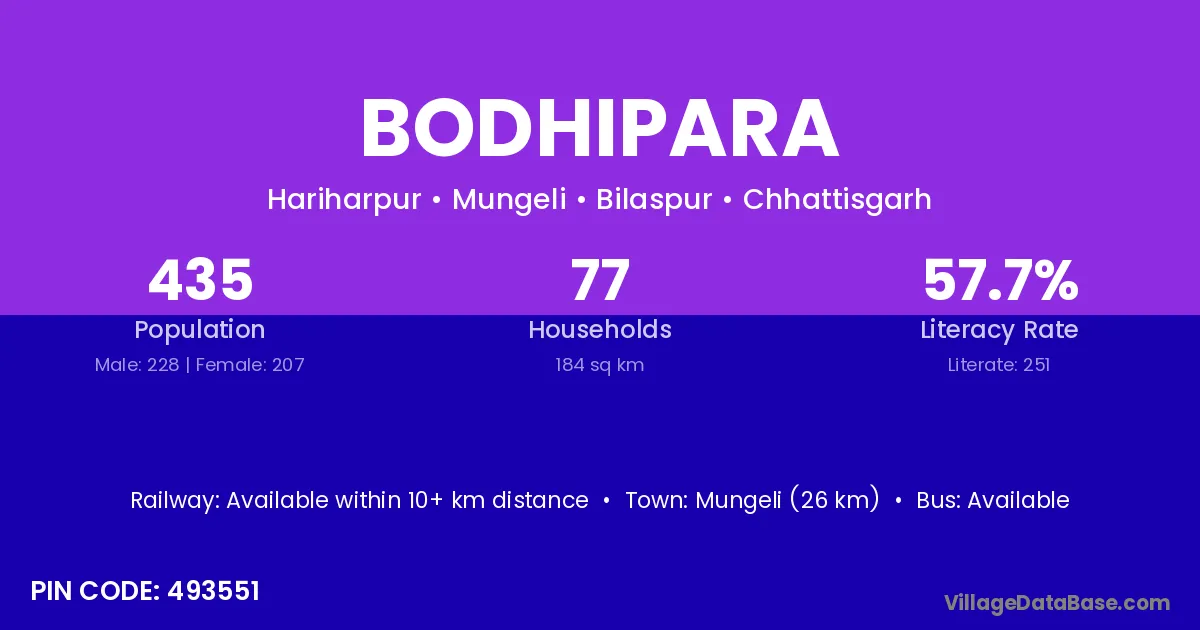 Mungeli (26 km) is the nearest town to Bodhipara village for major economic activities and is located approximately 26 km away.