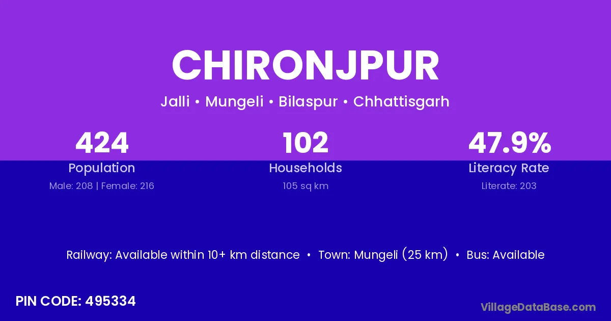 Mungeli (25 km) is the nearest town to Chironjpur village for major economic activities and is located approximately 25 km away.