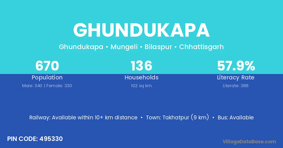Takhatpur (9 km) is the nearest town to Ghundukapa village for major economic activities and is located approximately 9 km away.